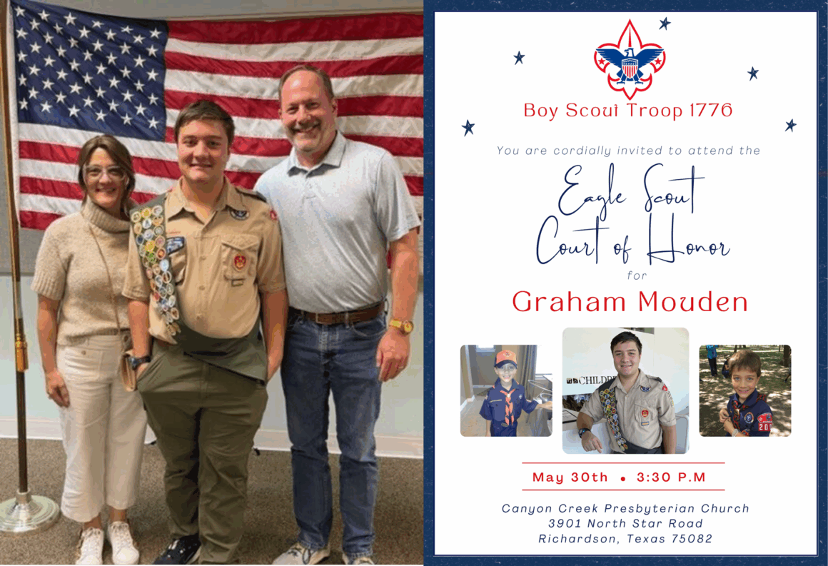 Troop 1776 all are welcome to help celebrate Graham Mouden’s Eagle Scout award. Please join the Mouden Family for Grahams Eagle Scout Court of Honor.